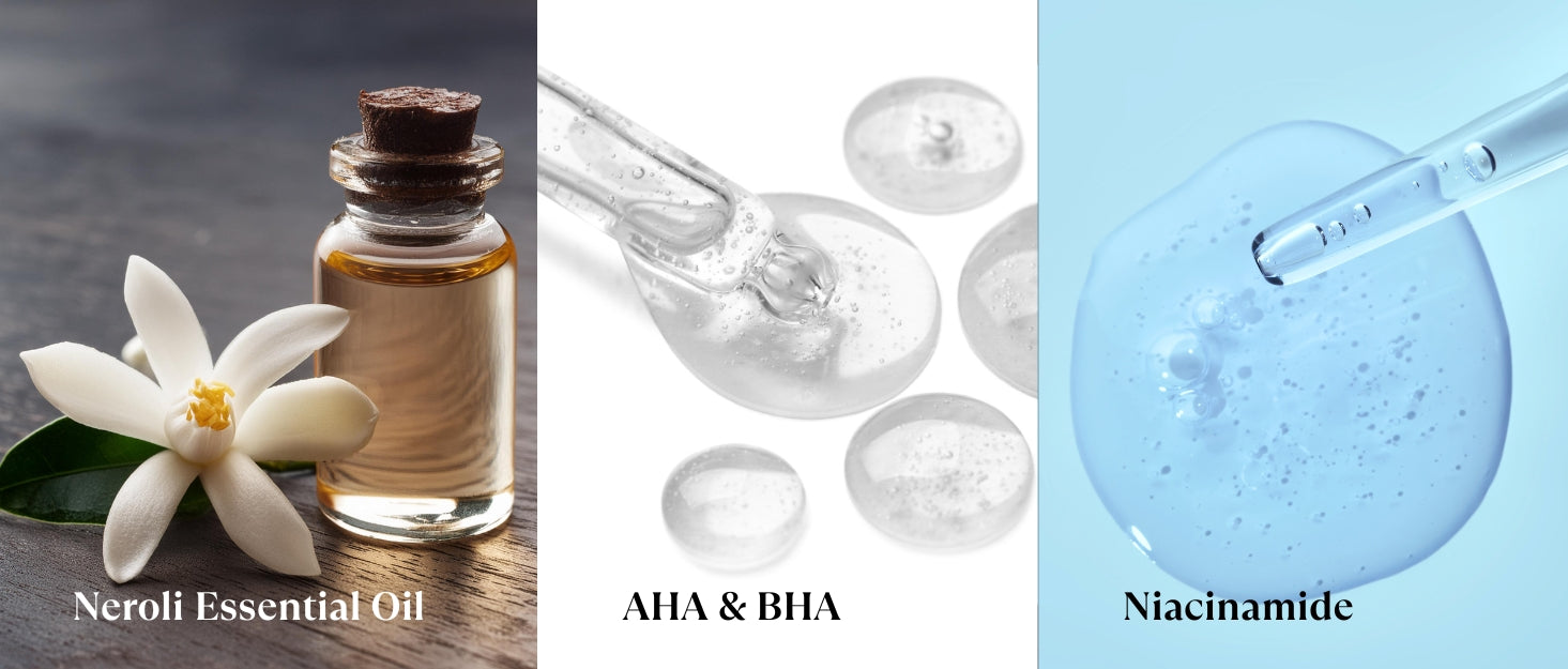 Neroli Face Wash combines Niacinamide, AHA, and Neroli Essential Oil, which work synergistically to gently exfoliate the skin, fade dark spots, and reduce dullness. These ingredients encourage skin cell turnover and improve clarity for a radiant, even-toned complexion.