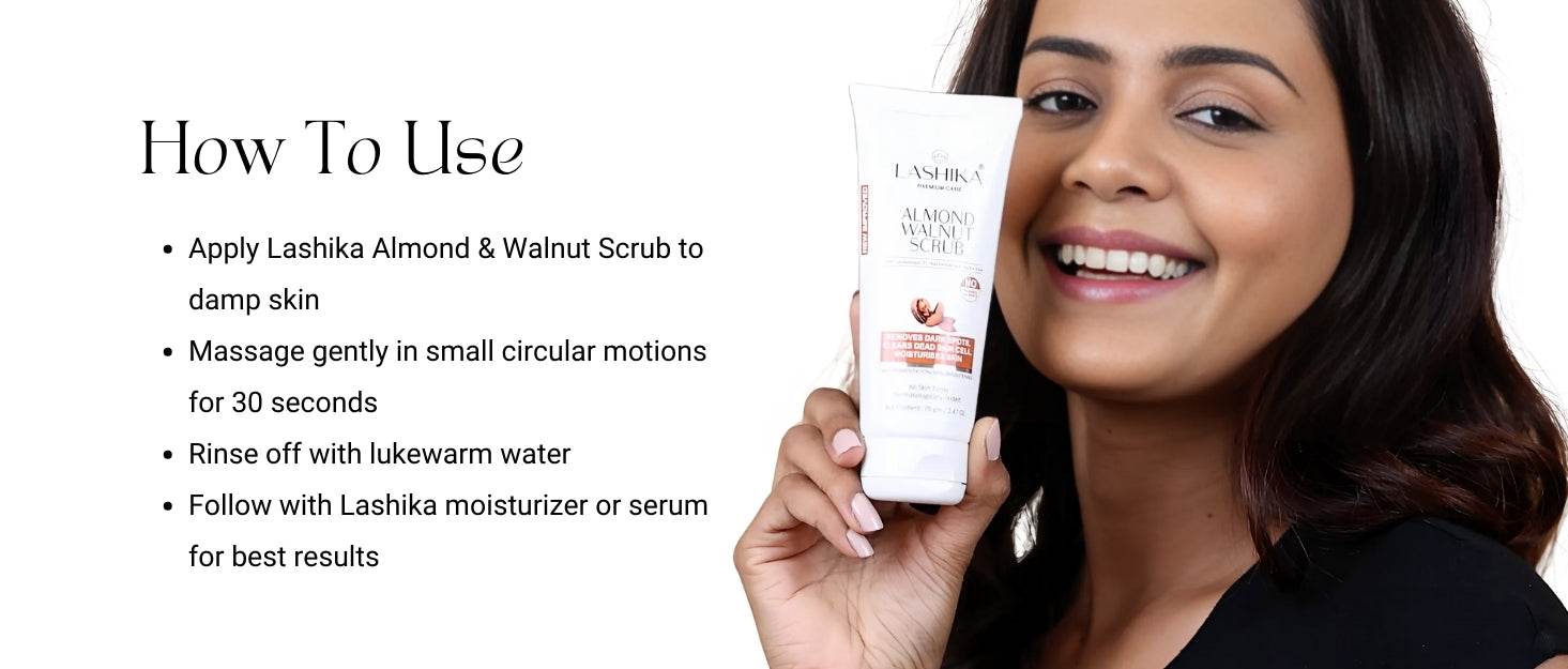 1. Apply Lashika Almond & Walnut Scrub to damp skin
