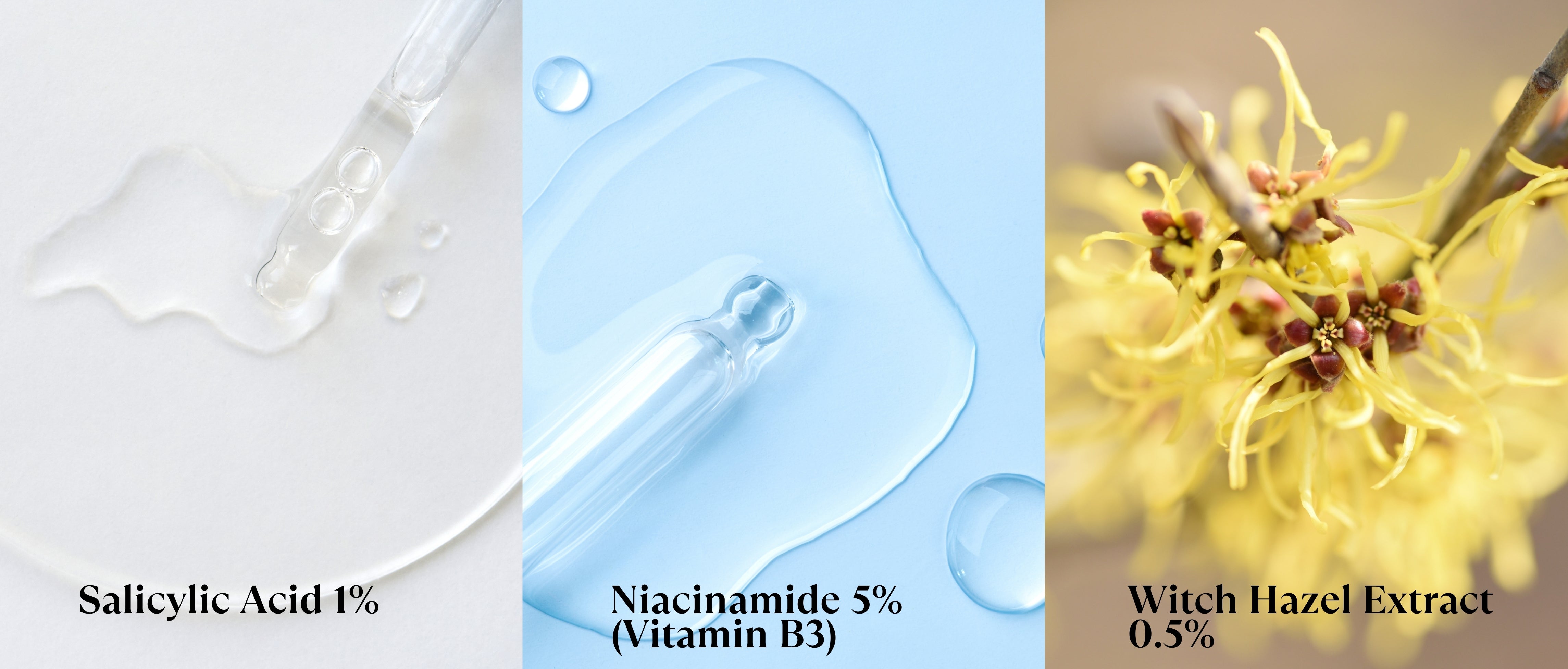 Aqua, Propylene Glycol, Caprylic/Capric Triglyceride, Niacinamide-5%, Polyacrylamide, C13-14 Isoparaffin, Laureth-7, Salicylic Acid-1%, Ethoxydiglycol, Phenoxyethanol, Cetearyl Olivate, Sorbitan Olivate, Hamamelis Virginiana Extract-0.5%, Citric Acid-0.3%, Perfume, Xanthan Gum, Allantoin, Disodium EDTA, С.І. 15985.